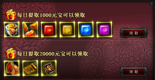 每日提取1000元宝以上可获得:暑期勋章*1,3级暴击宝石*1,4级攻击宝石*1,4级血魔宝石*1,4级物防宝石*1,4级魔防宝石*1。