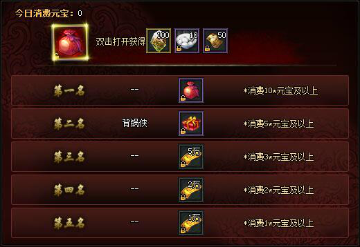 【活动内容】活动期间每日元宝消费排行前5名的玩家可获得丰厚道具奖励!