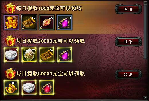 每日提取50000元宝以上可获得:元宵*10、5000元宝、经验玉(极品)*3;